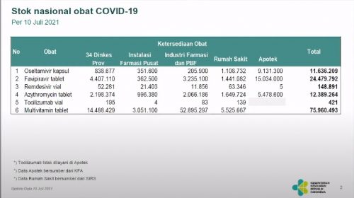 Saat ini stok obat terapi COVID-19 cukup banyak, antara lain Oseltamivir kapsul ada 11,6 juta tablet, Favipiravir ada 24,4 juta tablet, Remdesivir 148.891 vial.