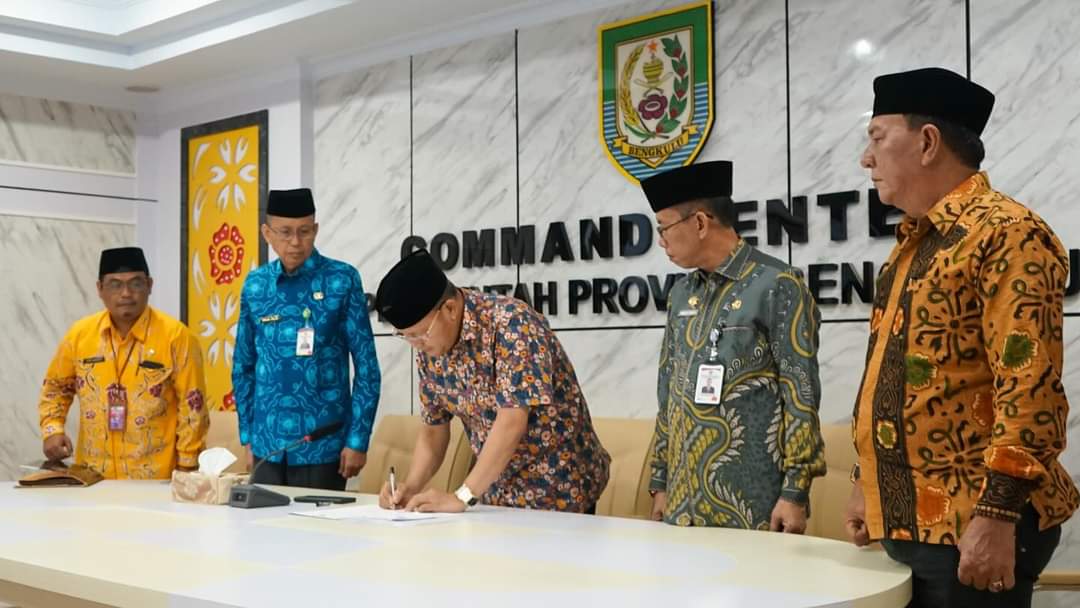 Gubernur Rohidin Mersyah Minggu 31/03/2024 menandatangani LKPD Provinsi Bengkulu di gedung command Center (Sumber foto: Mc.Bengkulu).