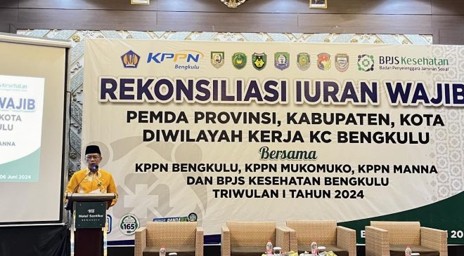 Bengkulu, Selimburcaya.com – Asisten III Pemerintah Provinsi Bengkulu, Nandar Munadi, menghadiri sekaligus membuka acara Rekonsiliasi Iuran Wajib Pemerintah Daerah (Pemda) Provinsi, Kabupaten, dan Kota di wilayah kerja Kantor Cabang (KC) Bengkulu. Acara ini juga dihadiri oleh perwakilan dari Kantor Pelayanan Perbendaharaan Negara (KPPN) Bengkulu, KPPN Mukomuko, KPPN Manna, serta BPJS Kesehatan Bengkulu untuk Triwulan I Tahun 2024.