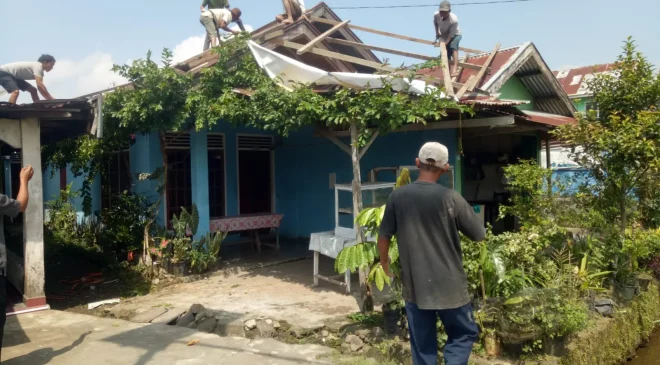 Rejang Lebong, Selimburcaya.com – Bengkel sepeda motor “Abeng Motor” di Jl. H. Agusalim Dusun III, Desa Rimbo Recap, Curup Selatan, mengalami kerusakan parah setelah atapnya diterbangkan oleh angin puting beliung sekitar pukul 11.40 WIB. Angin puyuh yang tiba-tiba muncul menyebabkan atap seng bangunan bengkel berukuran 3×3 meter dengan teras 3×4 meter tersebut terbang dan mendarat di atap rumah tetangga, Hendra.