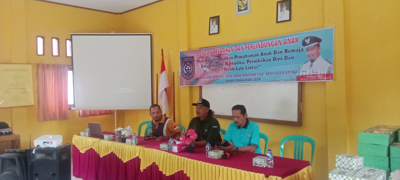 Bengkulu Utara, Selimburcaya.com – Pemdes Desa Sido Urip, Kecamatan Kota Arga Makmur, melaksanakan pelatihan dan penyuluhan perlindungan anak dengan tema, “Mari Kita Tingkatkan Pemahaman Anak dan Remaja dari Bullying, Narkotika, Pernikahan Dini, dan Tertib Lalu Lintas.”