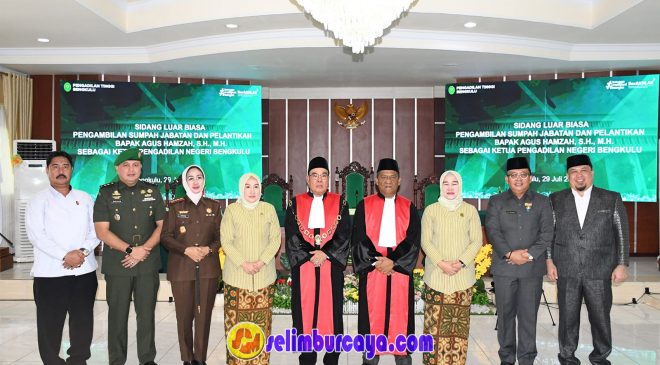 Bengkulu, Selimburcaya.com – Penjabat (Pj) Walikota Bengkulu yang diwakili oleh Pj Sekda Eko Agusrianto menghadiri pengambilan sumpah dan pelantikan Ketua Pengadilan Negeri baru, Agus Hamzah, S.H., M.H., di Aula R. Soebekti Pengadilan Tinggi Bengkulu, Senin (29/7).