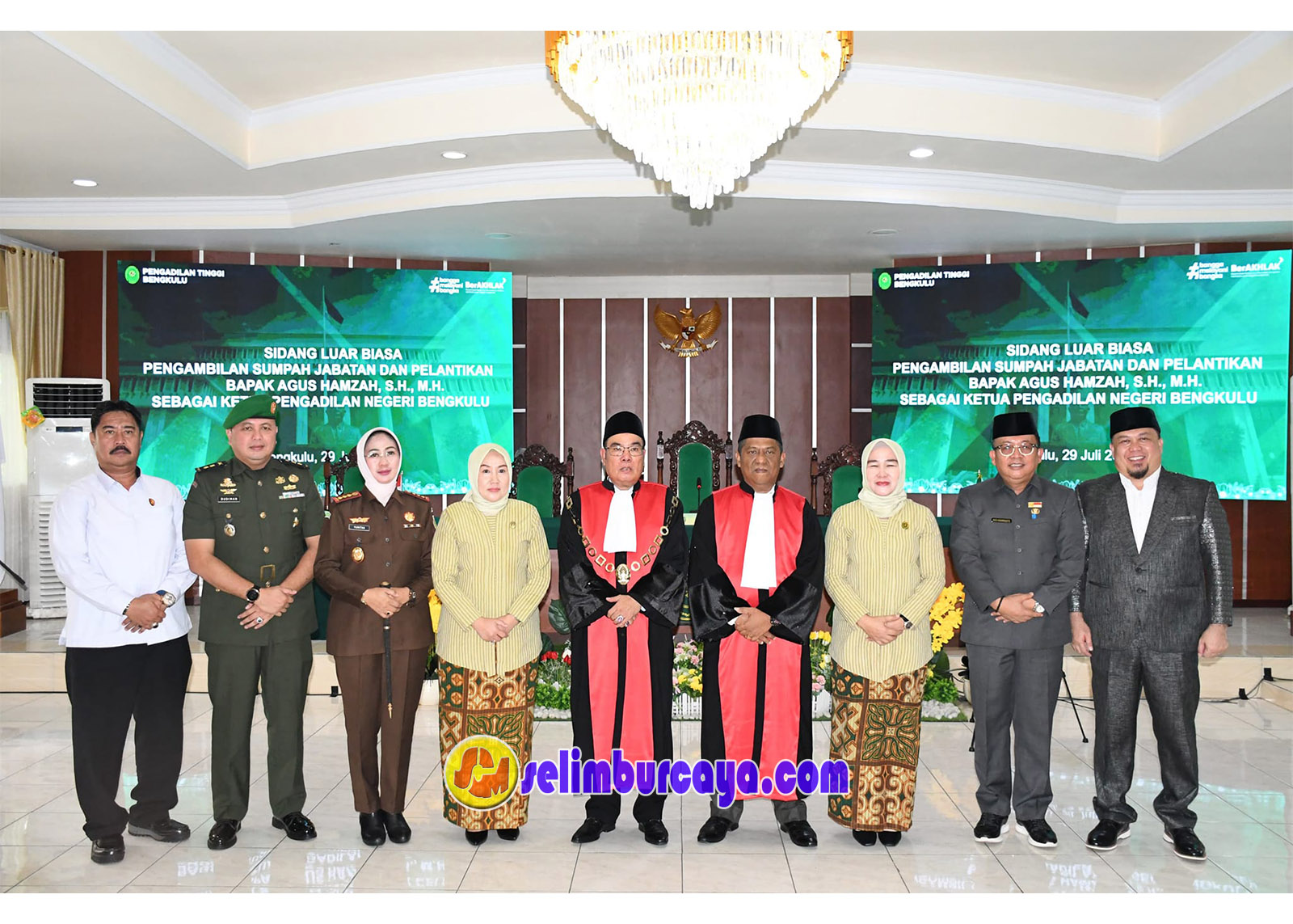 Penjabat (Pj) Walikota Bengkulu yang diwakili oleh Pj Sekda Eko Agusrianto menghadiri pengambilan sumpah dan pelantikan Ketua Pengadilan Negeri baru, Agus Hamzah, S.H., M.H., di Aula R. Soebekti Pengadilan Tinggi Bengkulu(29/07/2024)(foto:Yudi/Selimburcaya.com).