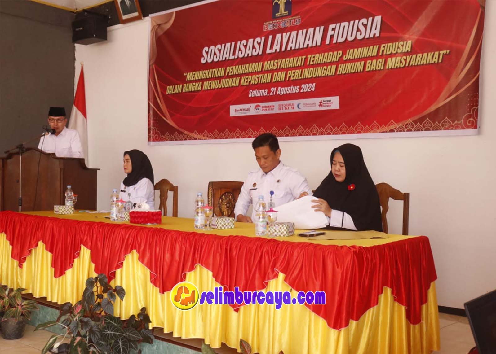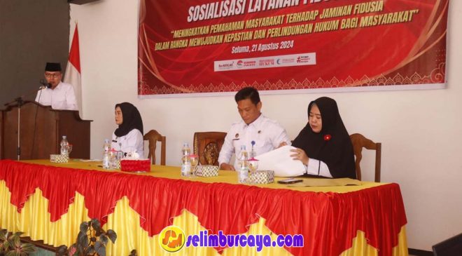 Seluma , Selimburcaya.com – Bupati Seluma yang diwakili oleh Asisten Pemerintahan dan Kesra, H. Hendarsyah, S.IP, MT, secara resmi membuka Sosialisasi Layanan Fidusia yang diselenggarakan oleh Kantor Wilayah Kementerian Hukum dan HAM Bengkulu di Hotel Arnanda Seluma pada Rabu, 21 Agustus 2024. Acara ini dihadiri oleh sejumlah Aparatur Sipil Negara (ASN) di lingkungan Pemerintah Kabupaten Seluma, perwakilan Dealer Astra, perbankan, masyarakat umum, Persatuan Wartawan Indonesia (PWI), serta sejumlah organisasi masyarakat (ormas) yang ada di Kabupaten Seluma.