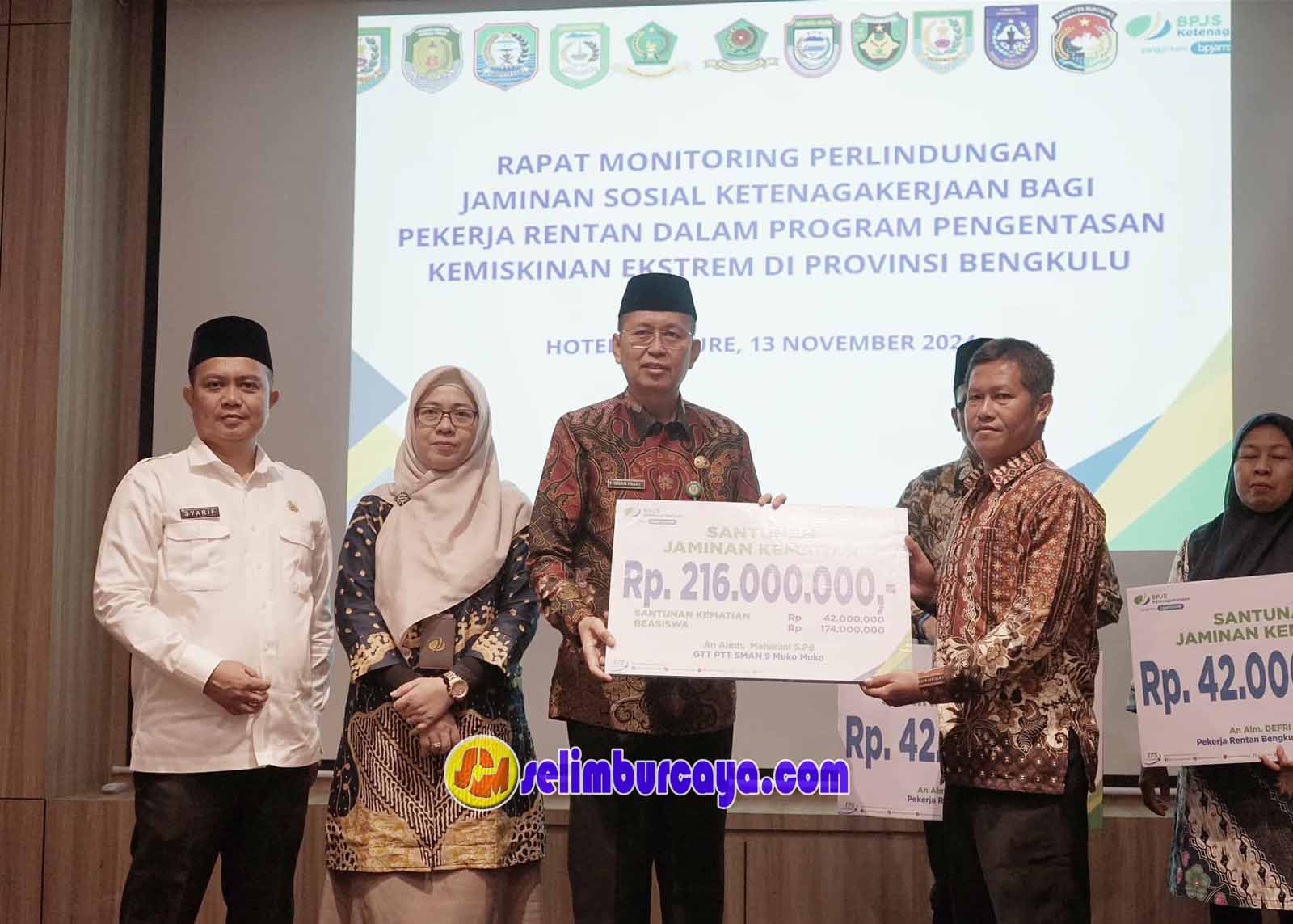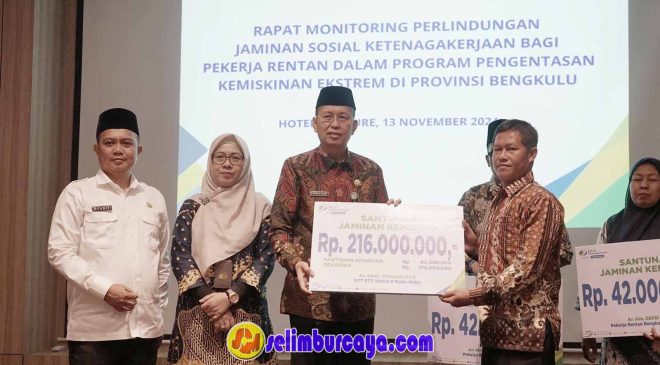 Bengkulu, Selimburcaya.com – Sekretaris Daerah (Sekda) Provinsi Bengkulu, Isnan Fajri, menyerahkan santunan bagi pekerja rentan dalam rangkaian acara monitoring perlindungan jaminan sosial yang digelar oleh BPJS Ketenagakerjaan Provinsi Bengkulu di Hotel Mercure, Bengkulu, pada Rabu (13/11). Santunan yang diberikan meliputi Jaminan Kecelakaan Kerja, beasiswa pendidikan, dan Jaminan Kematian.