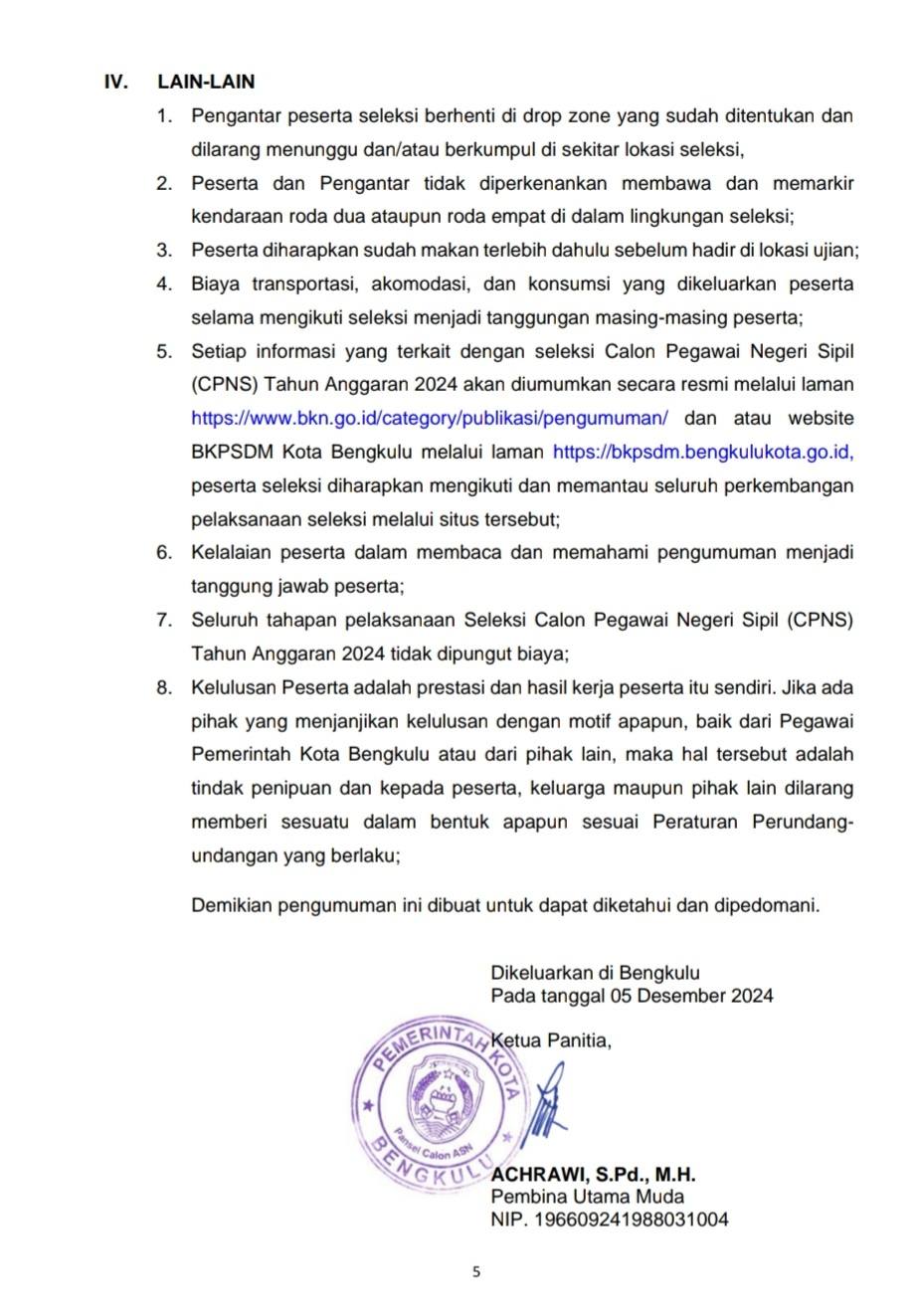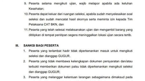 Panitia Seleksi menghimbau seluruh peserta untuk mempersiapkan diri dengan baik, mematuhi peraturan yang berlaku, dan memastikan kehadiran tepat waktu sesuai jadwal yang telah ditentukan.