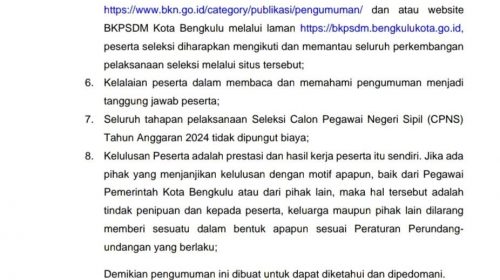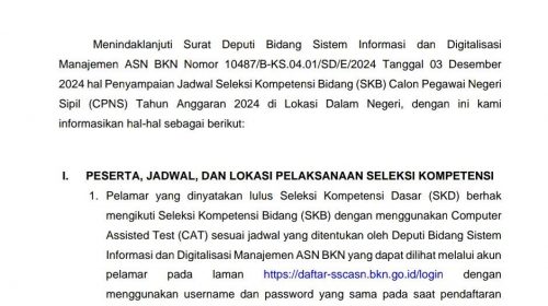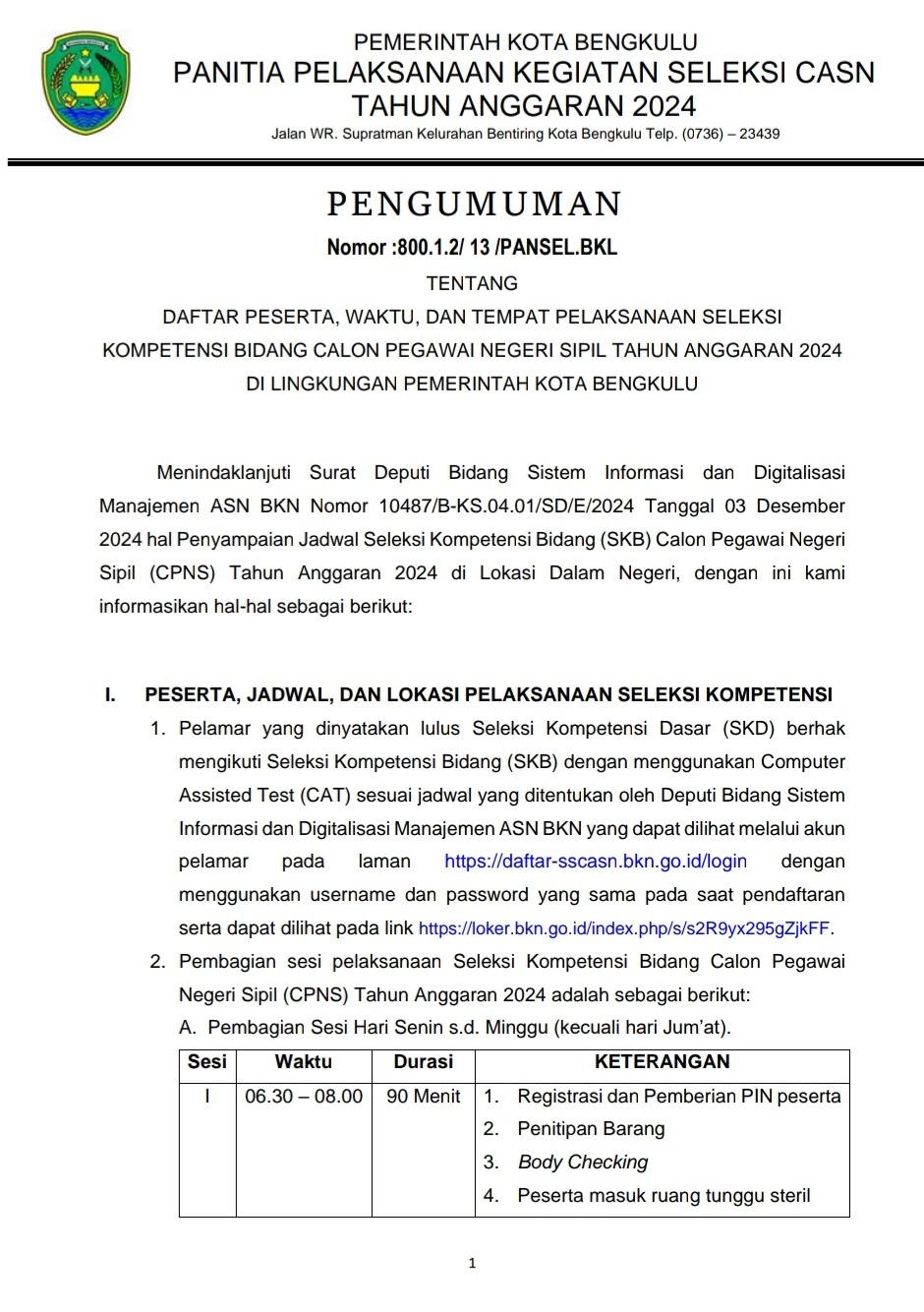 Bengkulu, Selimburcaya.com – Pemerintah Kota Bengkulu melalui Panitia Pelaksanaan Kegiatan Seleksi CASN Tahun Anggaran 2024 mengumumkan jadwal pelaksanaan Seleksi Kompetensi Bidang (SKB) bagi Calon Pegawai Negeri Sipil (CPNS). Pengumuman ini berdasarkan Surat Deputi Bidang Sistem Informasi dan Digitalisasi Manajemen ASN BKN Nomor 10487/B-KS.04.01/SD/E/2024 yang diterbitkan pada 3 Desember 2024.