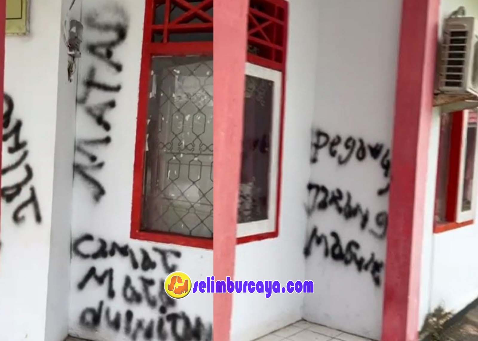 Beberapa tulisan bernada kritik keras seperti “Pegawai Jarang Masuk” dan “Camat Mata Rakus” terlihat mencemari dinding kantor. Hingga siang hari, pelaku vandalisme belum teridentifikasi. Coretan tersebut telah dibersihkan dengan cara mengecat ulang dinding oleh pegawai kantor camat.