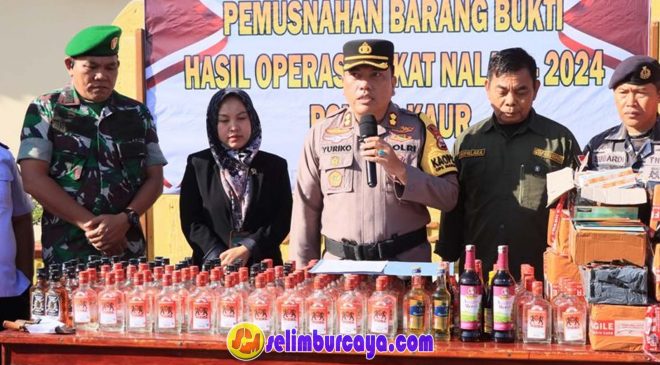 Kaur, Selimburcaya.com – Menjelang pergantian tahun, Polres Kaur memusnahkan sejumlah barang bukti hasil Operasi Pekat Nala II 2024. Kegiatan ini berlangsung pada Kemarin di Lapangan Satya Haprabu Mako Polres Kaur, dipimpin langsung oleh Kapolres Kaur, AKBP Yuriko Fernanda, SH, S.IK, MH, dan dihadiri jajaran personel serta pihak Pemkab Kaur.