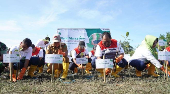 Bengkulu, Selimburcaya.com – Pertamina Patra Niaga Regional Sumbagsel melalui Fuel Terminal (FT) Pulau Baai berkolaborasi dengan Yayasan Kesejahteraan Madani (Yakesma) menanam 2.025 pohon mangrove jenis Rhizophora Mucronata di kawasan Pantai Mangrove Pulau Baai, Bengkulu.
