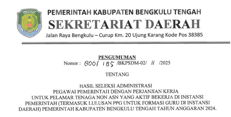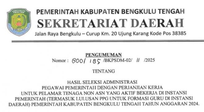 Bengkulu Tengah, Selimburcaya.com – Badan Kepegawaian dan Pengembangan Sumber Daya Manusia (BKPSDM) Kabupaten Bengkulu Tengah resmi mengumumkan hasil seleksi administrasi penerimaan Pegawai Pemerintah dengan Perjanjian Kerja (PPPK) tahap II.