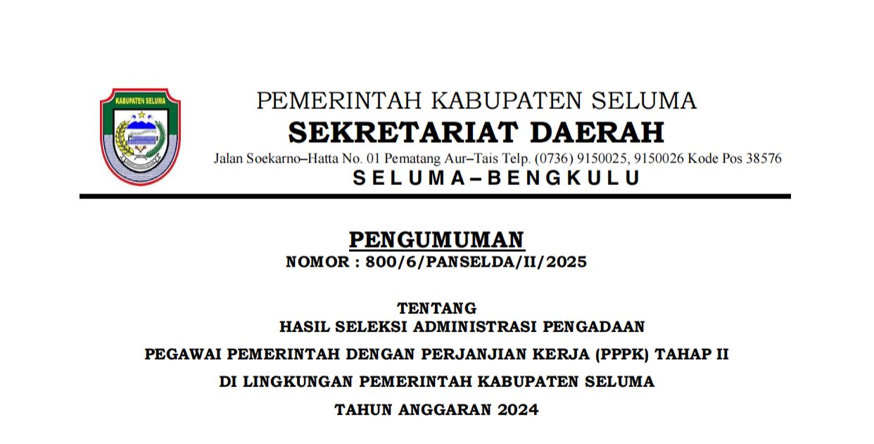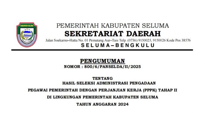 Seluma, Selimburcaya.com – Pemerintah Kabupaten (Pemkab) Seluma secara resmi mengumumkan hasil seleksi administrasi Pegawai Pemerintah dengan Perjanjian Kerja (PPPK) Tahap II. Pengumuman ini tertuang dalam PENGUMUMAN NOMOR: 800/6/PANSELDA/II/2025, yang ditandatangani oleh Sekretaris Daerah (Sekda) Seluma, H. Hadianto, SE, M.Si pada 19 Februari 2025.