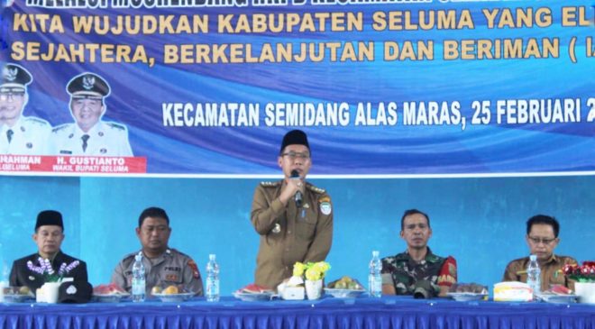 Seluma, Selimburcaya.com – Bupati Seluma yang diwakili oleh Asisten Administrasi dan Umum, Riduan Sabrin, ST, secara resmi membuka Musyawarah Rencana Pembangunan (Musrenbang) tingkat Kecamatan Semidang Alas Maras pada Selasa (25/2/2025). Acara ini berlangsung di Aula Kantor Camat Semidang Alas Maras dan dihadiri oleh unsur Forum Koordinasi Pimpinan Daerah (Forkopimda), perwakilan Bappeda Kabupaten Seluma, Kepala KUA Kecamatan Semidang Alas Maras, Lurah, Kepala Desa, serta Badan Permusyawaratan Desa (BPD) se-Kecamatan Semidang Alas Maras.