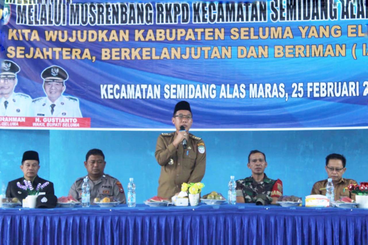 Camat Semidang Alas Maras, Nurdin, S.IP, dalam sambutannya menjelaskan bahwa Musrenbang merupakan agenda tahunan yang rutin dilaksanakan oleh Pemerintah Kabupaten Seluma. “Sebelum pelaksanaan Musrenbang tingkat kecamatan, kami telah melakukan Musrenbang tingkat desa,” ujarnya.