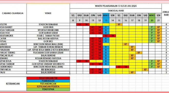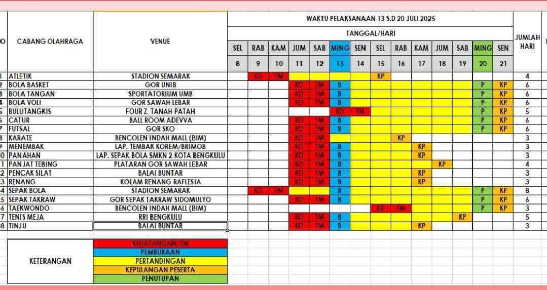Daftar lengkap venue pertandingan dirilis oleh KONI Bengkulu dan akan segera dipublikasikan kepada masyarakat luas, termasuk dalam bentuk informasi digital dan cetak.