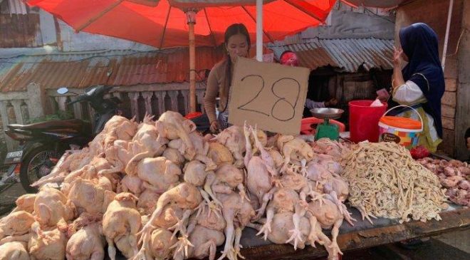 Bengkulu, Selimburcaya.com – Harga ayam potong di Pasar Tradisional Panorama Bengkulu terpantau mengalami penurunan drastis pasca Lebaran 2025. Dari yang sebelumnya dijual seharga Rp 38.000 per kilogram, kini harga ayam hanya berada di kisaran Rp 25.000 hingga Rp 28.000 per kilogram.