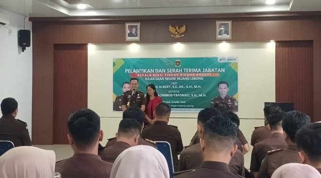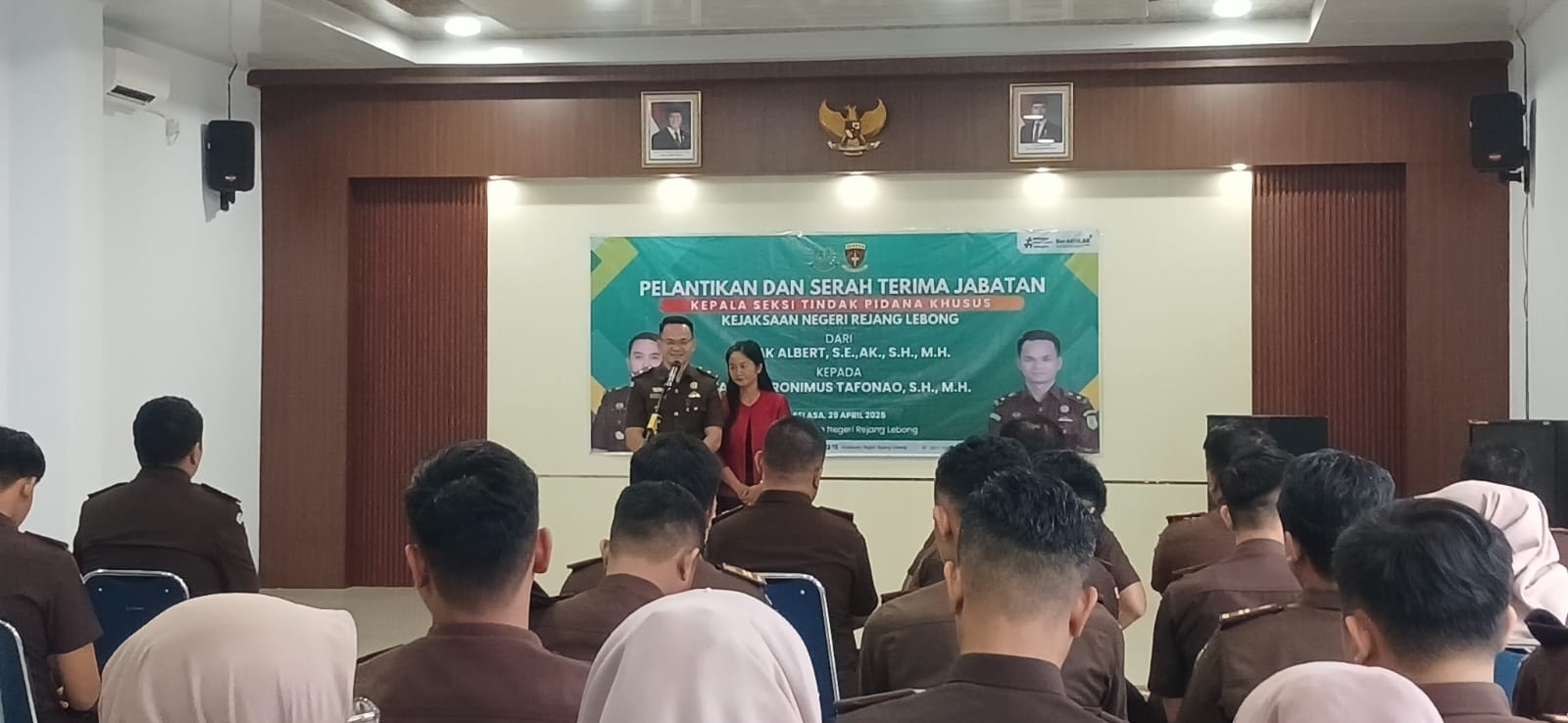 Rejang Lebong,Selimburcaya.com — Kejaksaan Negeri (Kejari) Rejang Lebong resmi melaksanakan pelantikan dan serah terima jabatan (sertijab) Kepala Seksi Tindak Pidana Khusus (Kasi Pidsus) pada Selasa (29/4/2025). Dalam kegiatan ini, posisi Kasi Pidsus resmi berganti dari Albert, SE., AK., SH., MH kepada Hironimus Tafonao, SH., MH.
