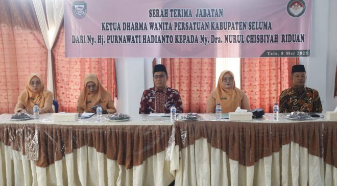 Seluma, Selimburcaya.com – Momentum bersejarah tercipta di Sekretariat Dharma Wanita Persatuan (DWP) Kabupaten Seluma, Kamis (8/5/2025), saat Ketua lama Ny. Hj. Purnawati Hadianto menyerahkan tongkat estafet kepemimpinan kepada sosok baru, Ny. Dra. Nurul Chisbiyah Riduan Sabrin. Acara serah terima jabatan ini dihadiri Plt. Sekretaris Daerah Kabupaten Seluma Riduan Sabrin, ST, Kepala Dinas PMD, dan seluruh pengurus DWP setempat.