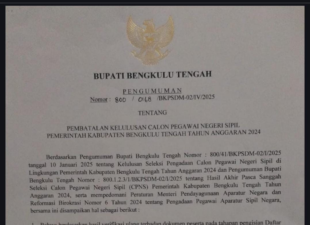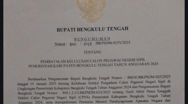 Bengkulu Tengah, Selimburcaya.com – Pemerintah Kabupaten (Pemkab) Bengkulu Tengah resmi membatalkan kelulusan satu peserta Calon Pegawai Negeri Sipil (CPNS) tahun 2024. Pembatalan ini dilakukan menyusul keputusan peserta yang secara resmi mengundurkan diri dari formasi yang sebelumnya telah dilamarnya.