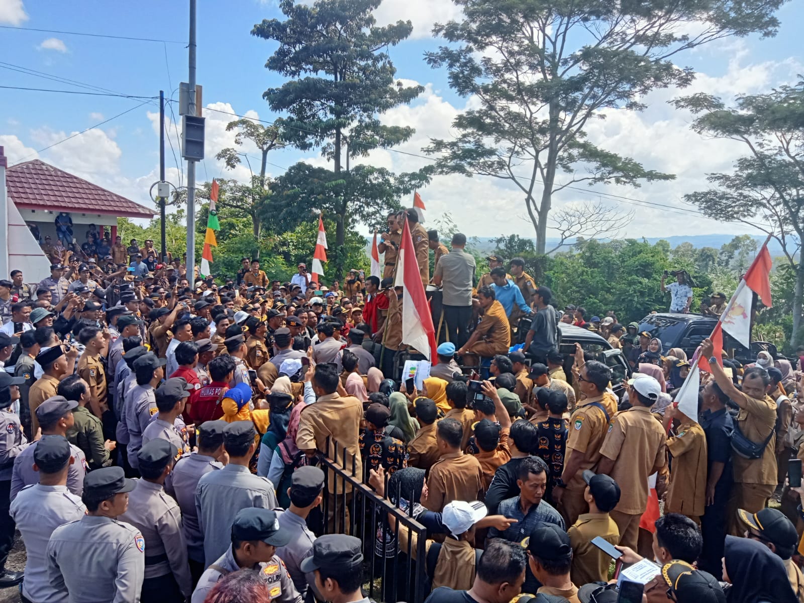 Dengan lantang, massa menyuarakan tuntutan mereka di bawah terik matahari. Aksi ini berlangsung damai namun penuh tekanan emosional, sebagai luapan kekecewaan atas keterlambatan hak mereka sebagai aparatur pemerintahan di tingkat desa.