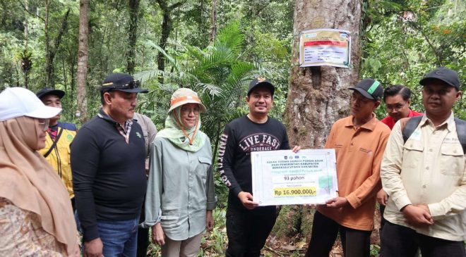 Bengkulu Utara, Selimburcaya.com — Sebuah momen bersejarah tercipta di Desa Batu Raja R, Bengkulu Utara, Rabu (11/6/2025), ketika Bupati Bengkulu Utara Arie Septia Adinata secara simbolis menyerahkan dana sebesar Rp16 juta kepada Renaldi, Ketua Lembaga Pengelola Hutan Desa (LPHD) Lemo Nakai. Dana tersebut dialokasikan untuk mengasuh 93 pohon dalam kawasan Hutan Desa Lemo Nakai, yang kini menjadi percontohan nasional dalam program Pohon Asuh.