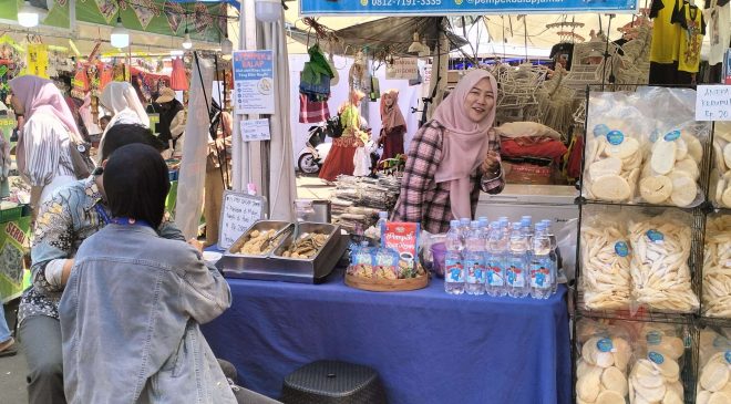 Maya Puspita, pelaku usaha Pempek Balap, menyampaikan antusiasmenya saat berjualan di tengah ribuan pengunjung yang memadati area festival.Jumat (04/07/2025)(foto:Zoel/Selimburcaya.com)