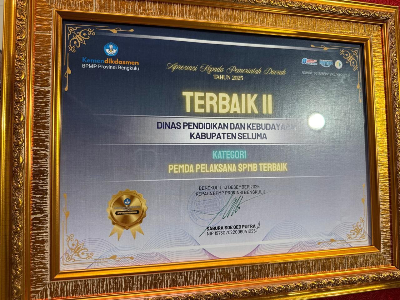 Penghargaan tersebut diharapkan dapat menjadi motivasi bagi seluruh pemangku kepentingan pendidikan di Kabupaten Seluma untuk terus berinovasi, meningkatkan kinerja, serta memperkuat kolaborasi dalam rangka menciptakan layanan pendidikan yang berkualitas. Upaya ini sejalan dengan visi pembangunan daerah dalam mencetak sumber daya manusia yang unggul, berdaya saing, dan berkarakter. (adv)